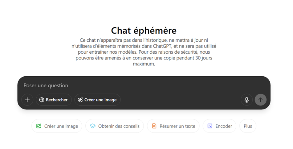 Bien que vos conversations en mode éphémère ne soient pas utilisées pour entraîner les modèles d'IA, ChatGPT précise que "pour des raisons de sécurité, nous pouvons conserver une copie de cette conversation pendant 30 jours au maximum".